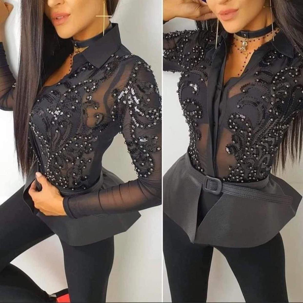 Oszałamiające body wykonane z siateczkowej tkaniny, z ozdobnymi cekinami oraz nitowanymi koralikami. Zapinane z przodu na guziki które pozwalają regulować głębokość dekoltu według własnego uznania. Elastyczny i komfortowy materiał idealnie dopasuje się do Twoich kształtów.