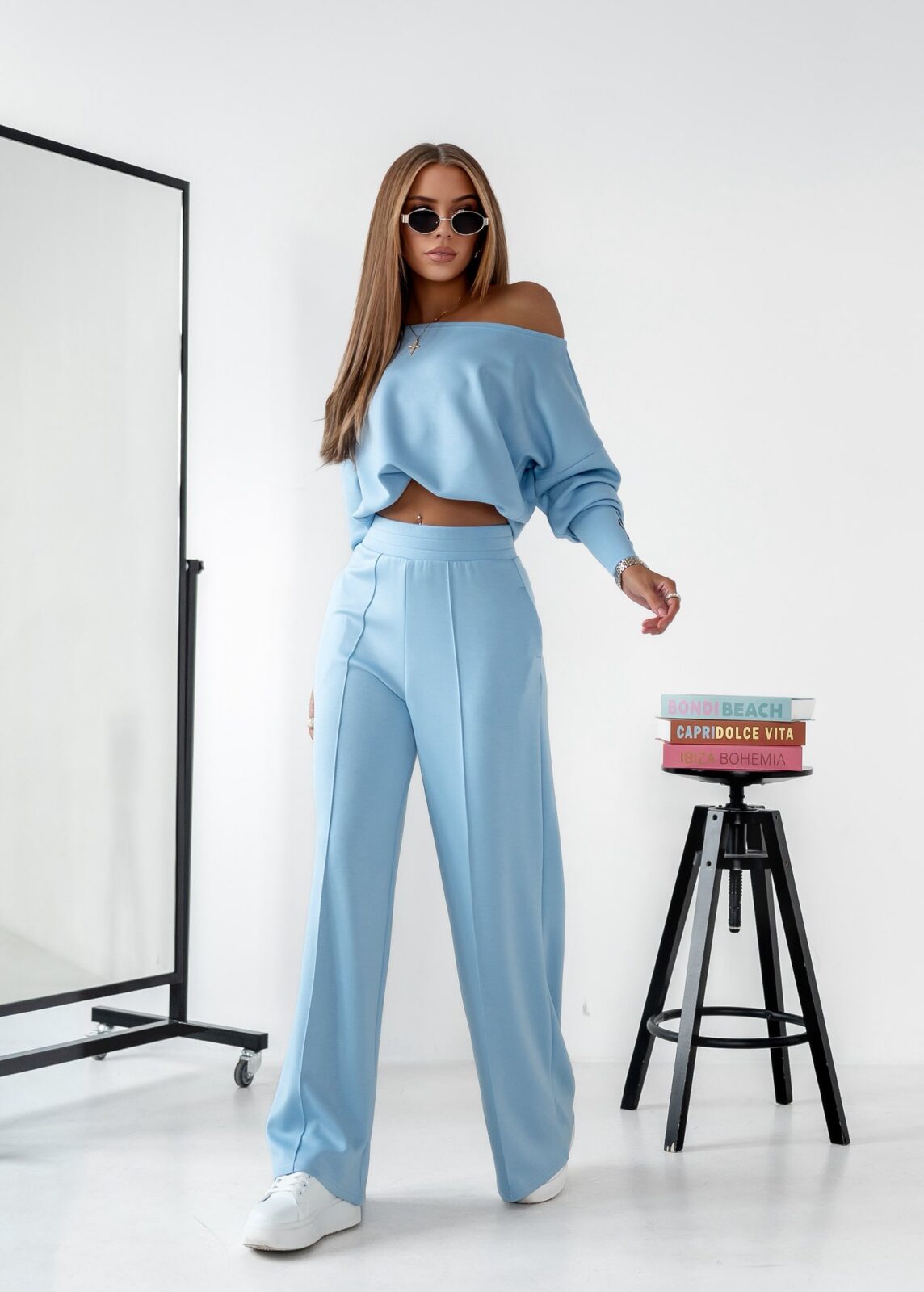 Komplet Manon oversizowy komplet , spodnie o luźnym kroju typu szwedy z przeszyciem wzdłuż nogawki oraz bluza z długim mankietem ozdobionym haftem. Gumka w pasie, dzięki której można regulować długość bluzy. Wykonany z wiskozy.