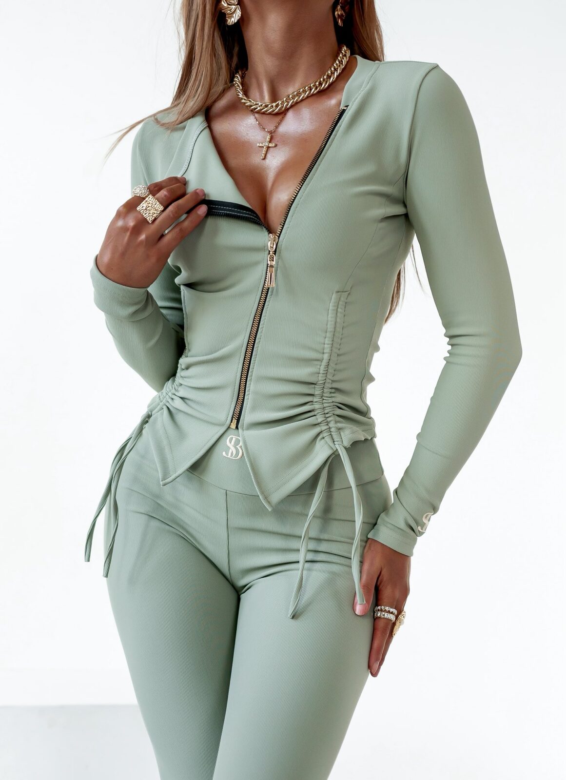 Dopasowana bluzka o asymetrycznym kroju zapinana na złoty zamek ozdobiona minimalistycznym haftowanym logo. Leginsy z szerokim pasem oraz efektownym marszczeniem na pośladkach podkreślającym kobiece kształty. Komplet wykonany z elastycznego fit materiału pięknie modelującego sylwetkę.